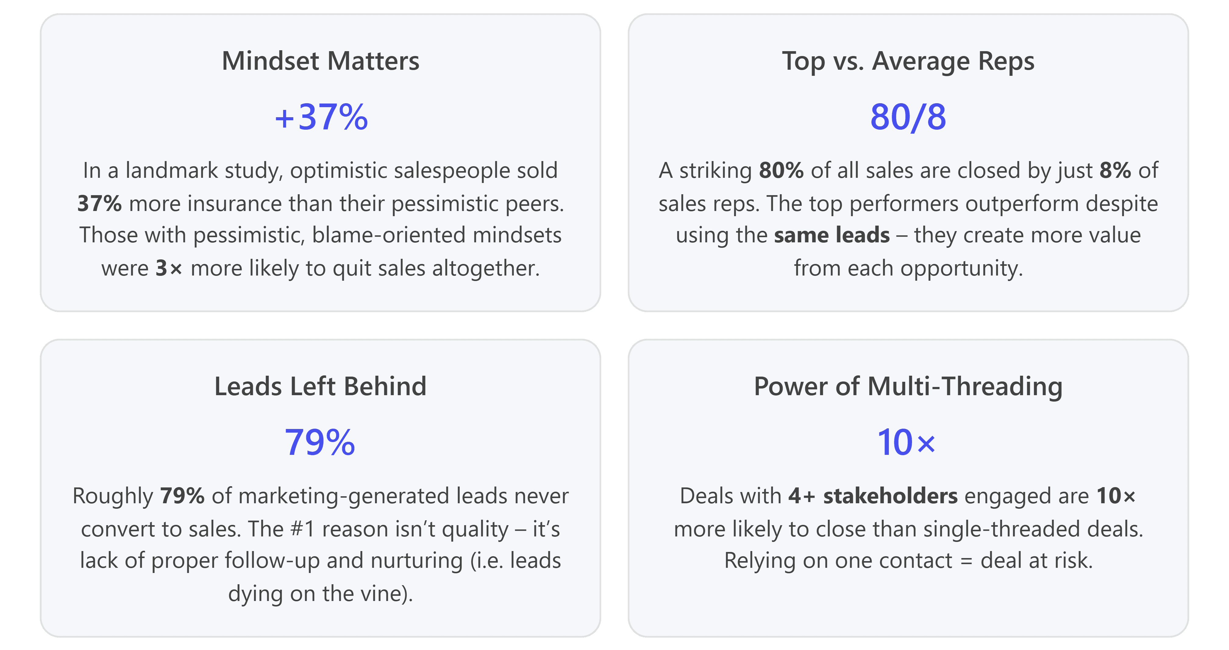 The evidence – from psychology experiments to sales org analytics – shows that taking ownership of the conversion process is the hallmark of high performance. By treating every lead as an opportunity (until proven otherwise) and arming yourself with the skills and systems to develop it, you reclaim control. That shift from victim to owner yields concrete results: higher sales, larger pipelines, more consistent forecasts, and tighter team alignment. The data we’ve presented gives confidence that this isn’t just theory; it’s replicable fact. Just as importantly, it’s empowering. Sellers and leaders alike can break free from the “bad leads” trap and instead focus on what can be done – because there is always something that can be done. Whether it’s asking better questions, finding an internal champion, or simply making that fifth follow-up call, these actions move the needle. Over time, they compound into a superior win rate and a healthier sales organization. The best sales teams have learned one of the most valuable lessons in business: inputs may be beyond your control, but how you convert those inputs is almost entirely up to you. And mastering that conversion process is what separates predictable growth from random results. The next time someone says “these leads are junk,” you’ll know – and now have the stats to prove – that the real differentiator isn’t the leads, it’s what your team does with them.